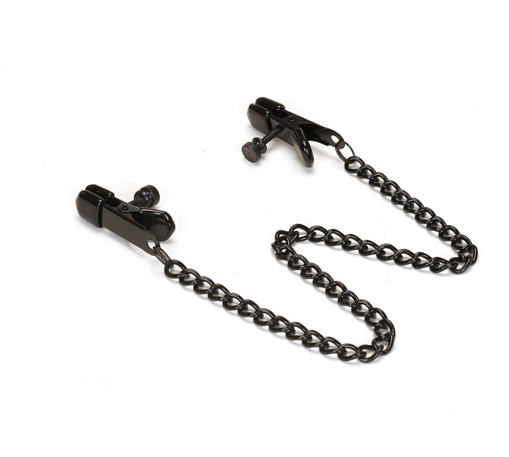 Затискачі на ланцюжку для сосків. Оснащені силіконовими накладками, щоб не травмувати ніжну шкіру, але водночас дають змогу доволі сильно стискати соски завдяки гвинтам. Загальна довжина (затискачі + ланцюжок): 43 см.