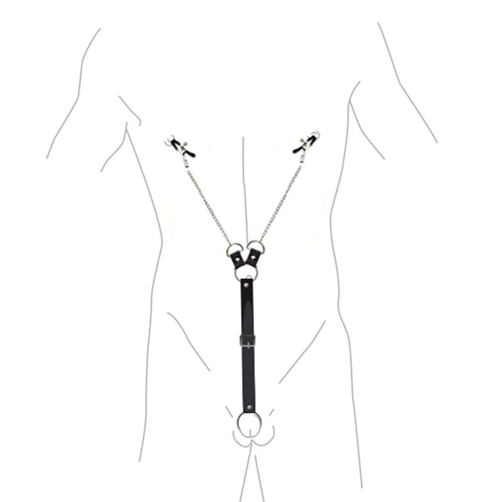 У затискачів є регулятори, за допомогою яких можна змінювати силу натиску і, відповідно, гостроту відчуттів. На кінцях затискачі закриті спеціальними м’якими ковпачками, щоб не пошкодити ніжну шкіру сосків. До затискачів за допомогою металевих ланцюжків і кілець кріпиться регульований ремінь. А ось тут на вашого чоловіка чекає сюрприз! На кінці ременя є металеве кільце, що кріпиться на пеніс. У такий спосіб партнер отримує додаткову стимуляцію.
